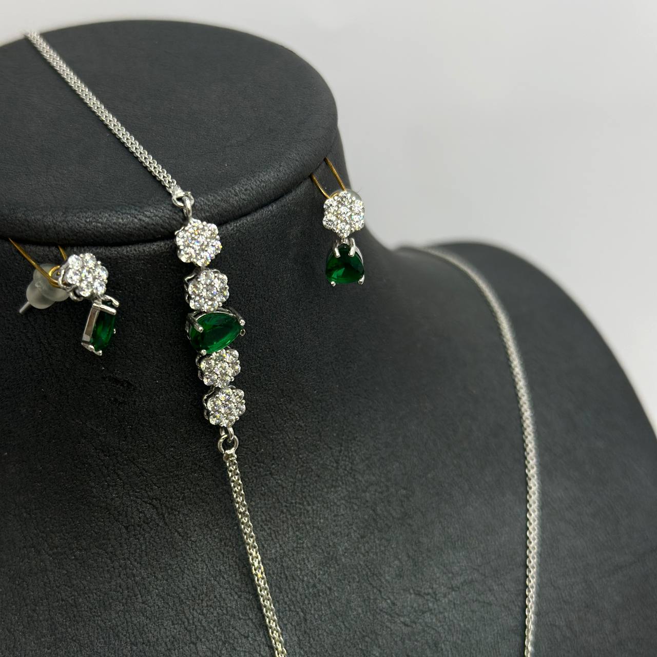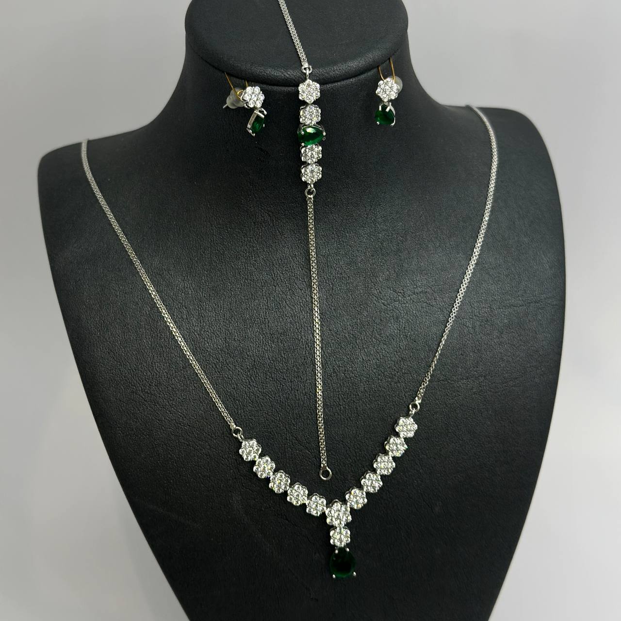 سرویس نگیندار سبز با درخشش چشمنواز خود، جلوهای لوکس و خاص به استایل شما میبخشد. طراحی ظریف و هماهنگ این سرویس، ترکیبی از ظرافت و شکوه را در گردنبند، گوشواره و دستبند به نمایش میگذارد و برای مجالس و مناسبتهای خاص انتخابی ایدهآل است.