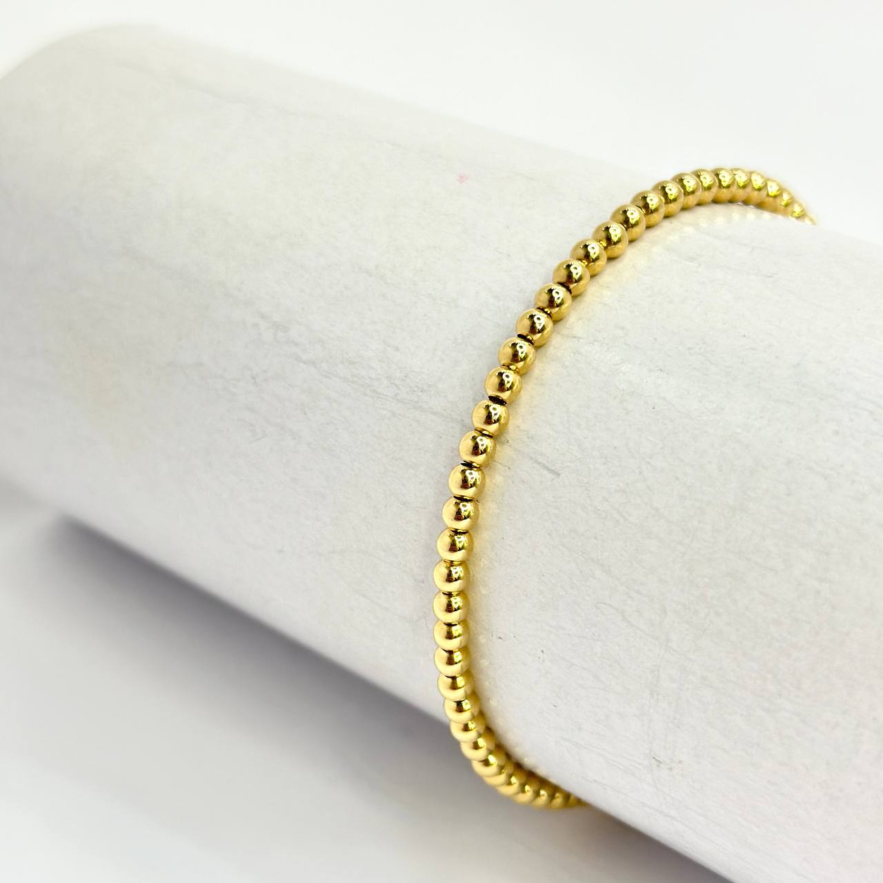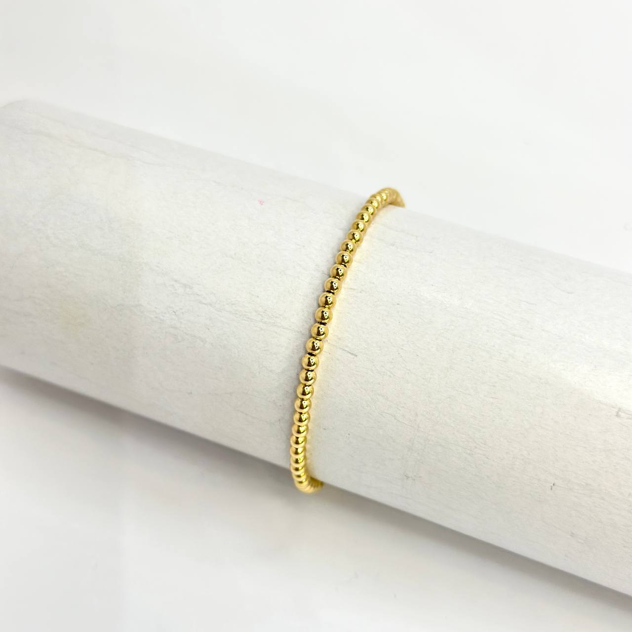 دستبند گوی با طراحی ساده و در عین حال شیک، ترکیبی از ظرافت و درخشش را به دستان شما هدیه میدهد. گویهای طلایی در این مدل با نظمی زیبا کنار هم قرار گرفتهاند و جلوهای کلاسیک و همیشه مد روز ایجاد کردهاند.