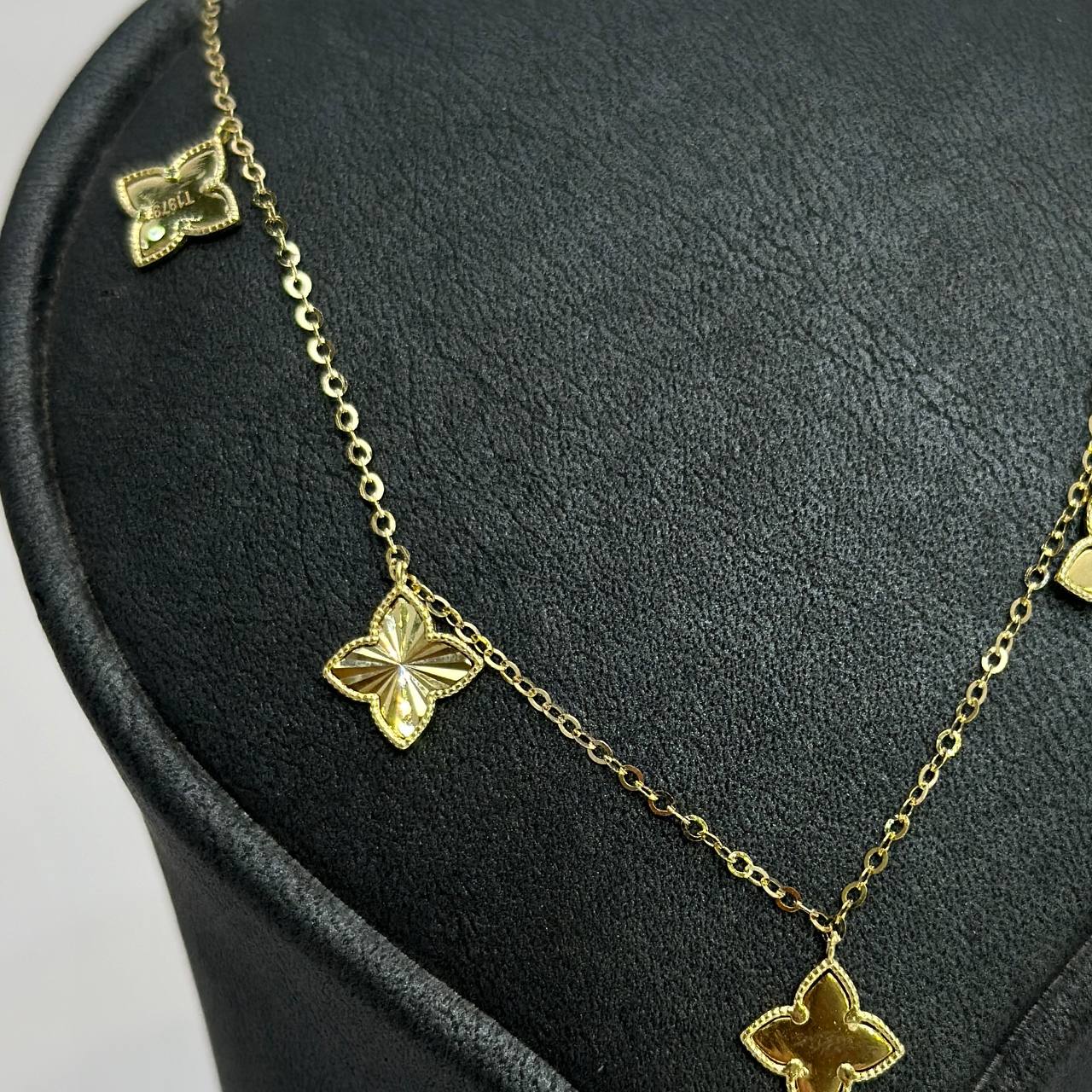 گردنبند ونکلیف با طراحی الهامگرفته از برند لوکس Van Cleef & Arpels، نمادی از ظرافت، زیبایی و درخشش جاودانه است. گلهای کلاسیک این مدل با ترکیب طلای ۱۸ عیار، جلوهای خاص و زنانه به استایل شما میبخشند.
