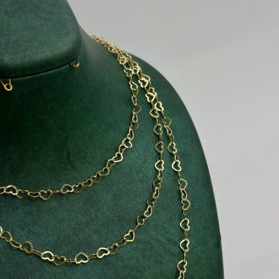زنجیر قلبی با طراحی لطیف و عاشقانه، نمادی از عشق و احساس است. فرم ظریف حلقههای قلبی در کنار درخشش